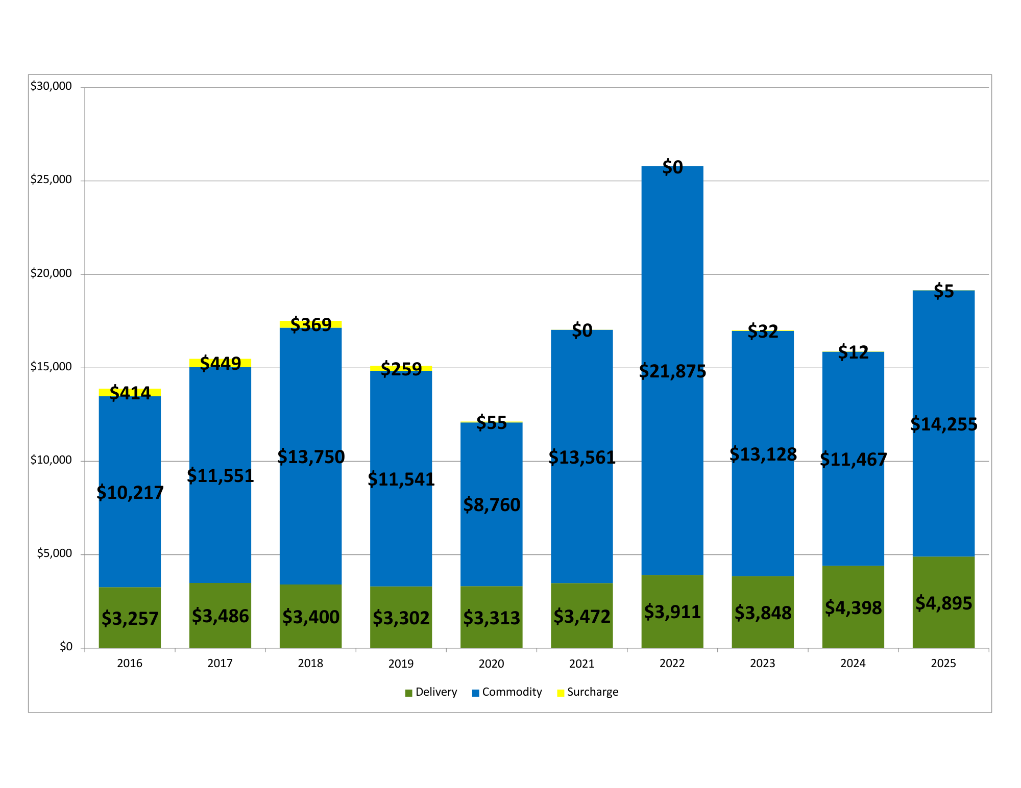 Interested in what comprises a typical large nonresidential natural gas bill? The graphs below compare average monthly natural gas bills over the last ten years for large nonresidential customers who purchased their natural gas supply from RG&E.
