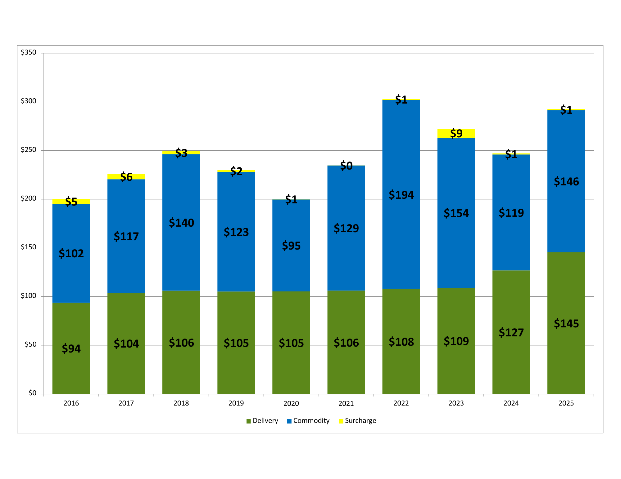 Interested in what comprises a typical small nonresidential natural gas bill? The graphs below compare average monthly natural gas bills over the last 10 years for small nonresidential customers who purchased their natural gas supply from RG&E.